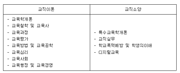 가. 교직이론 과목은 이수코드가 '교직'으로 지정된 교과목으로 교직과목(2학점) 중 '교직이론' 및 '교양소양' 부분에 포함되는 강의를 2과목 이상 이수해야함.